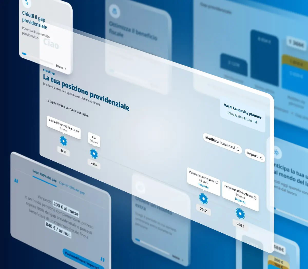 Il Longevity Planner è un simulatore avanzato e intuitivo: integra i risultati dei tuoi check-up (sia base che avanzato), visualizza scenari alternativi e ti guida nella pianificazione del patrimonio nel tempo. In poche mosse capisci dove sei e quali scelte ti avvicinano ai tuoi obiettivi.Chiudi il gap previdenziale